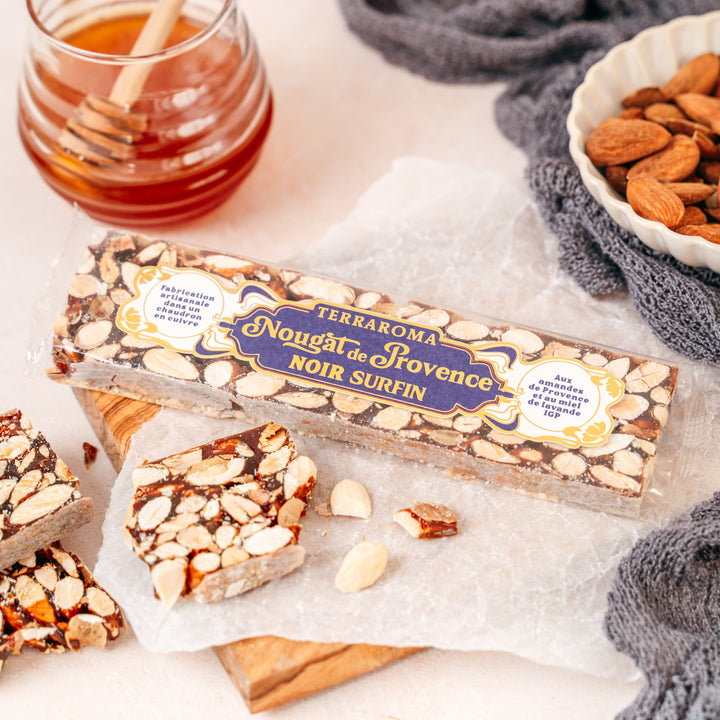 Plongez au cœur de la tradition provençale avec notre Nougat de Provence Noir Surfin, une confiserie artisanale de caractère, élaborée à partir de nos amandes de Provence cultivées à Valensole et de miel de lavande IGP. Cuit lentement dans un chaudron en cuivre, ce nougat noir offre une texture ferme et croquante, fidèle à la recette provençale d’antan.